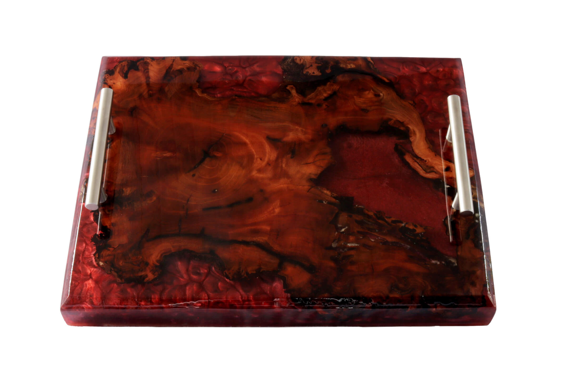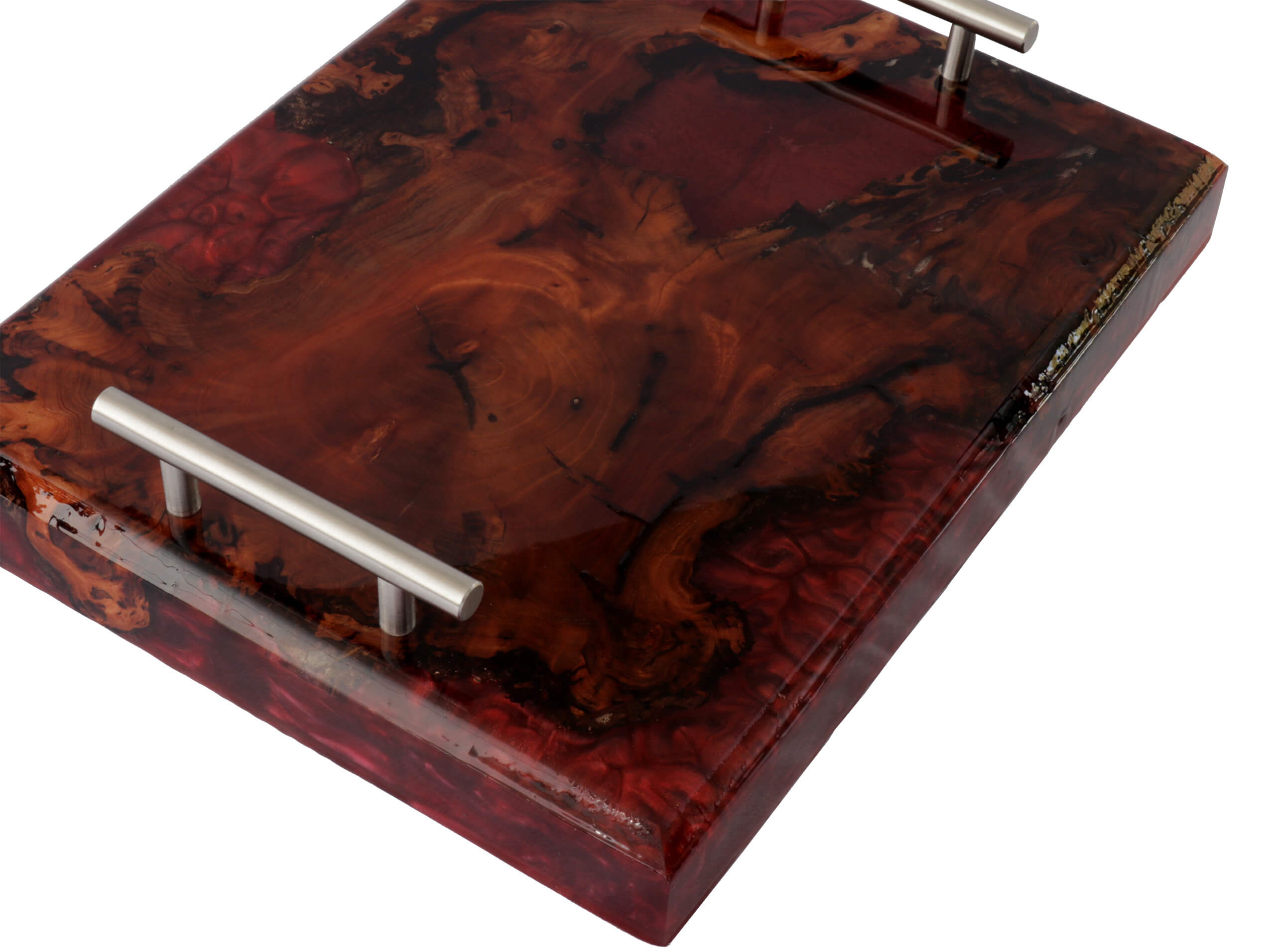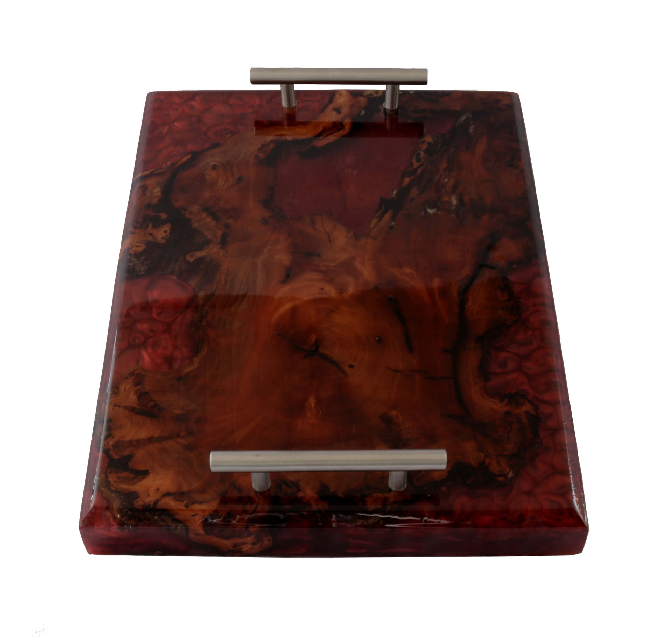 Medium size rectangular charcuterie serving board with beveled edges and stainless-steel handles. Handcrafted with Chinese Elm wood encased with burgundy epoxy resin. Black rubber feet for extra support.