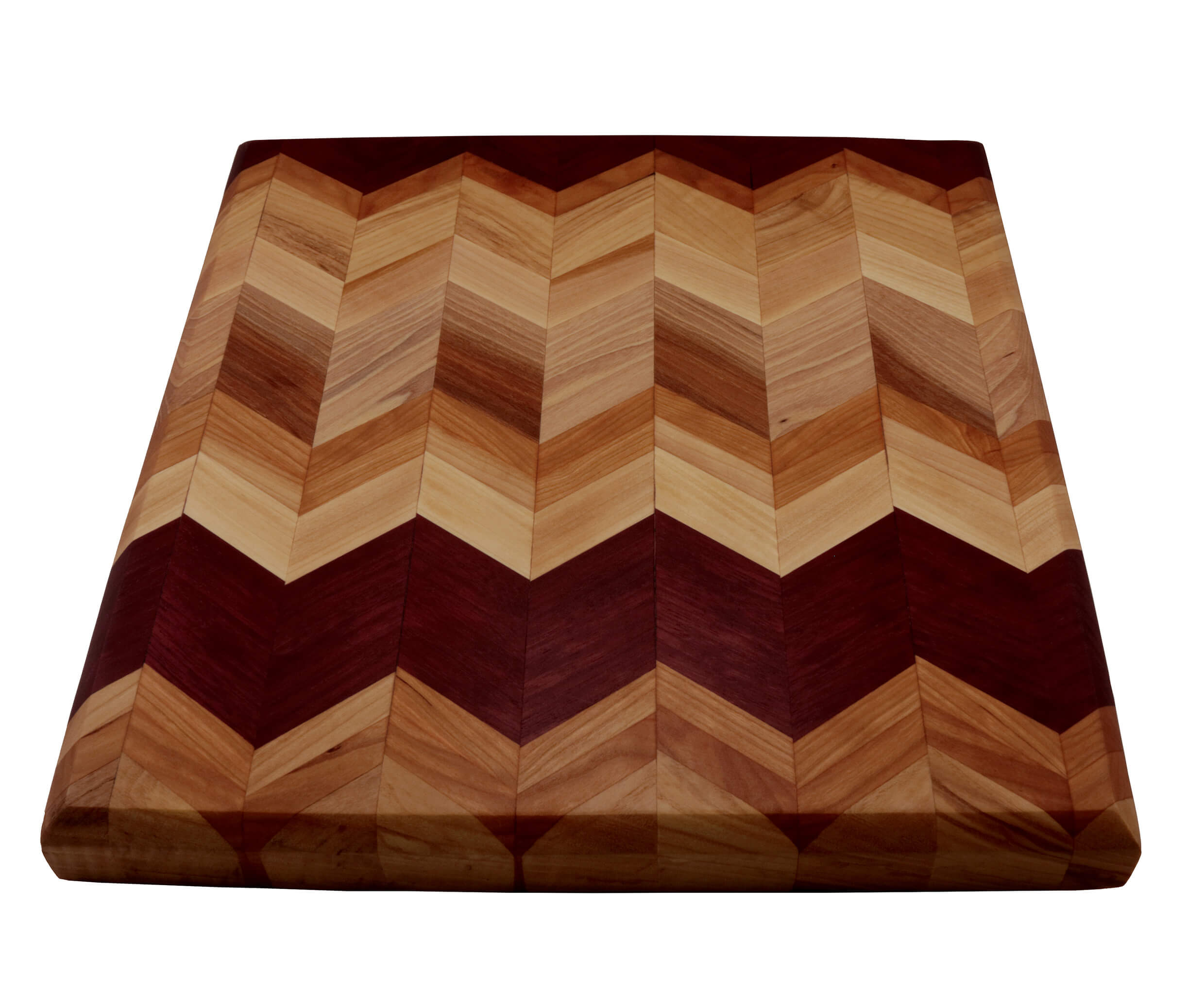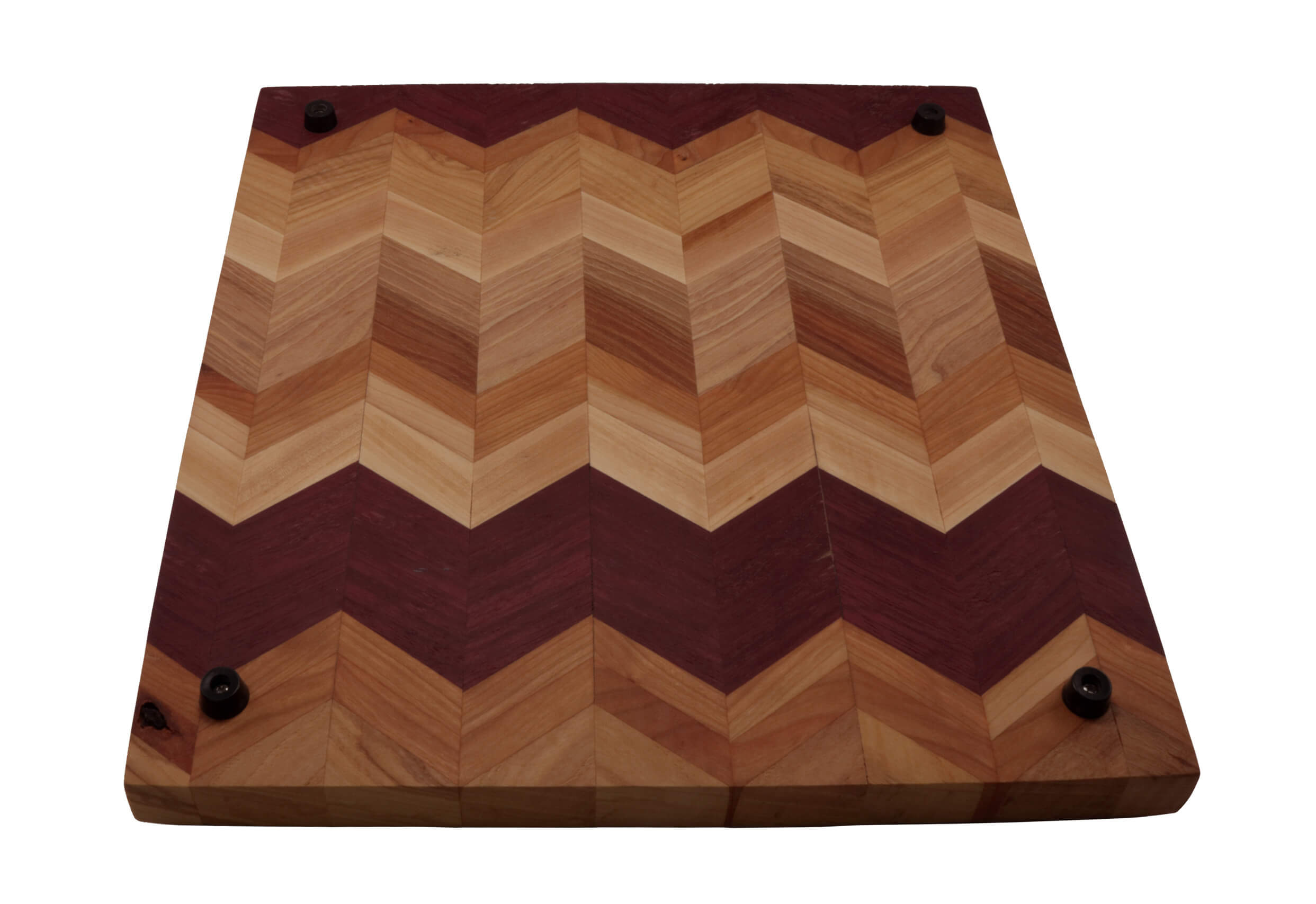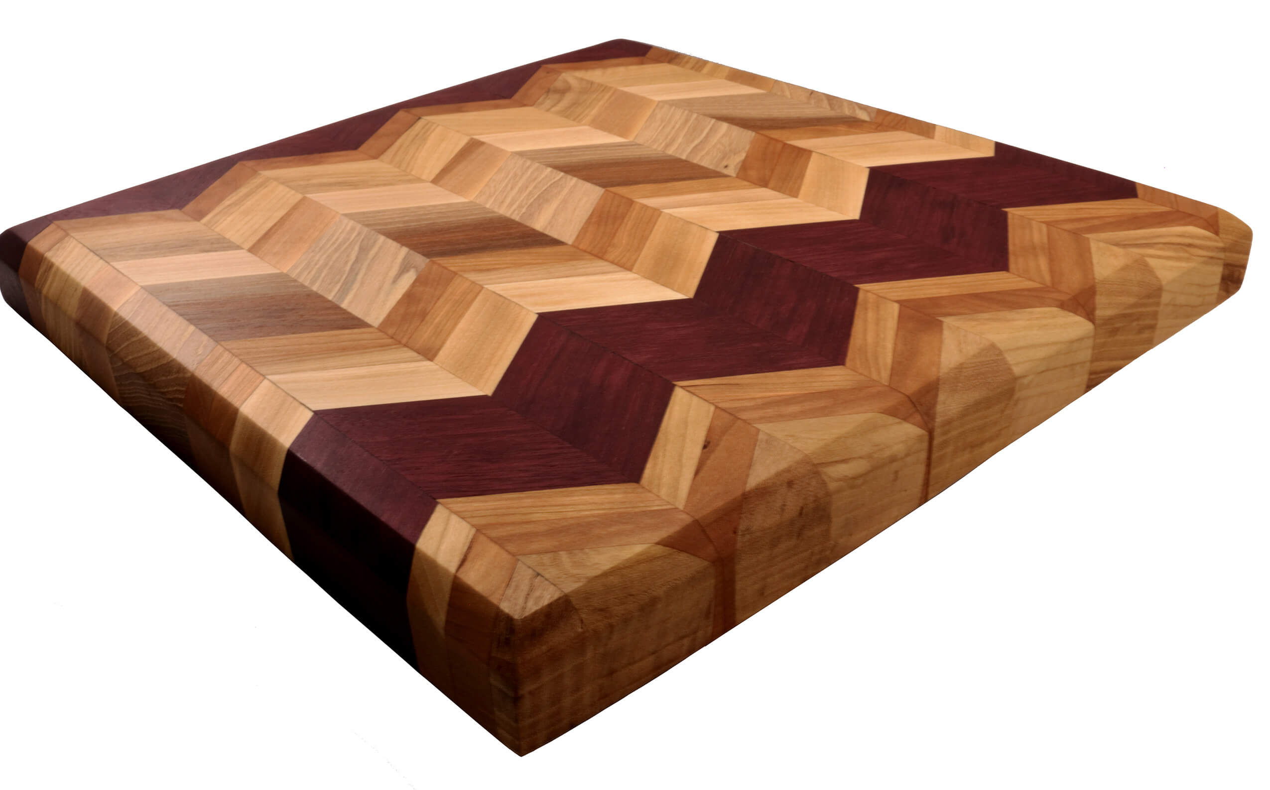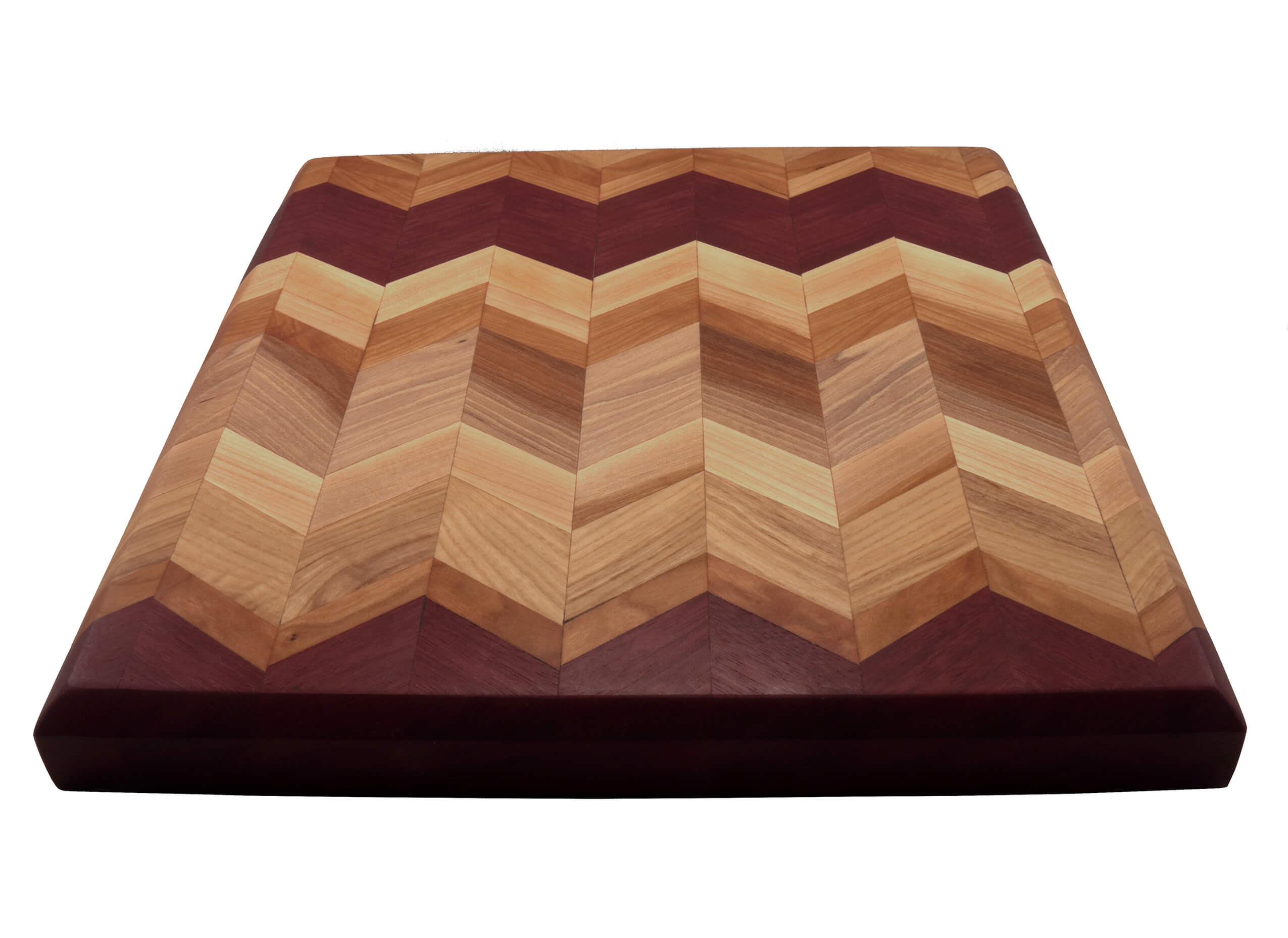 Medium square Chevron cutting board with beveled edges. Handcrafted with Birch, Hickory and Purple Heart wood and finished with mineral oil and/or cutting board oil. Black rubber feet for extra support.