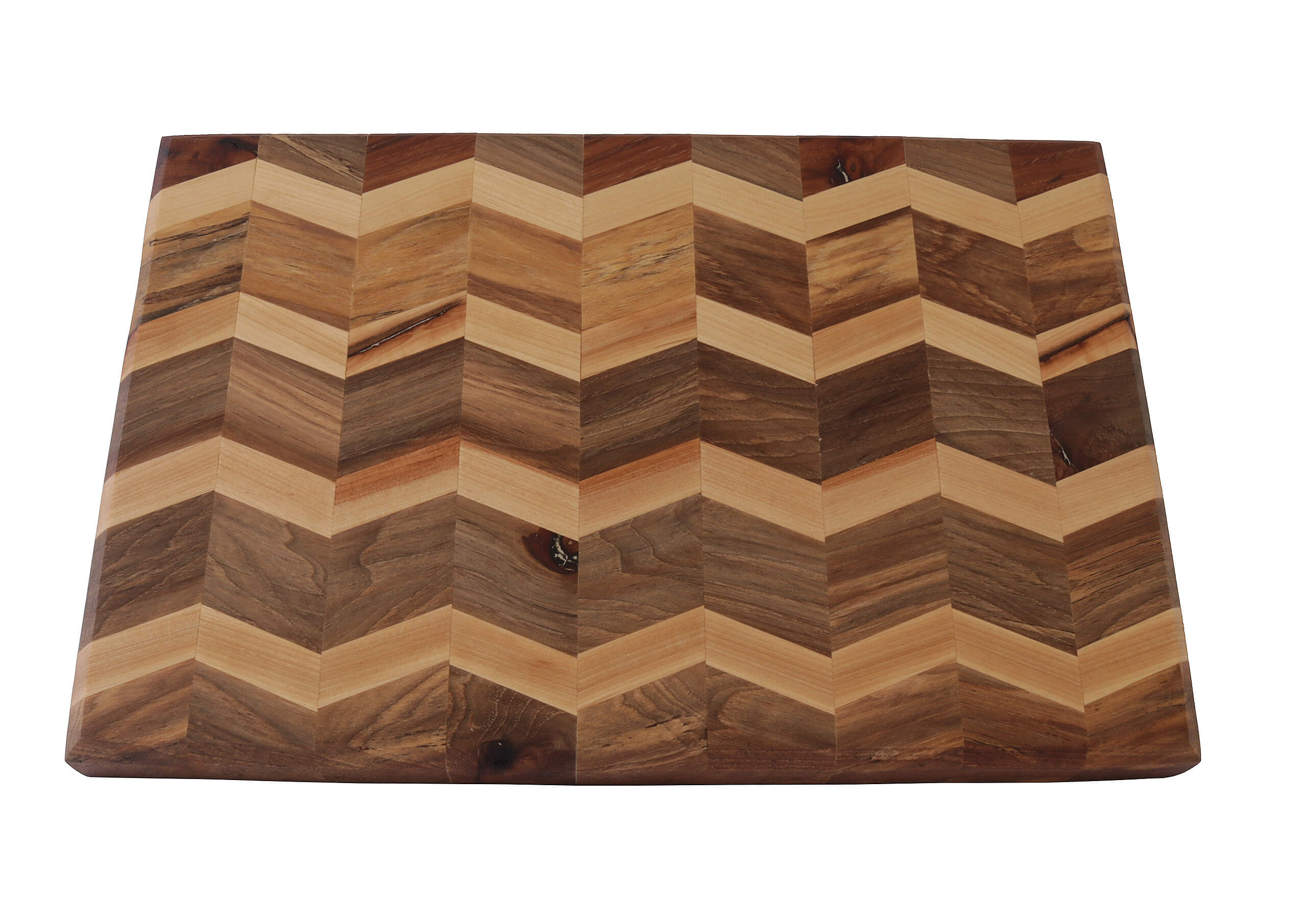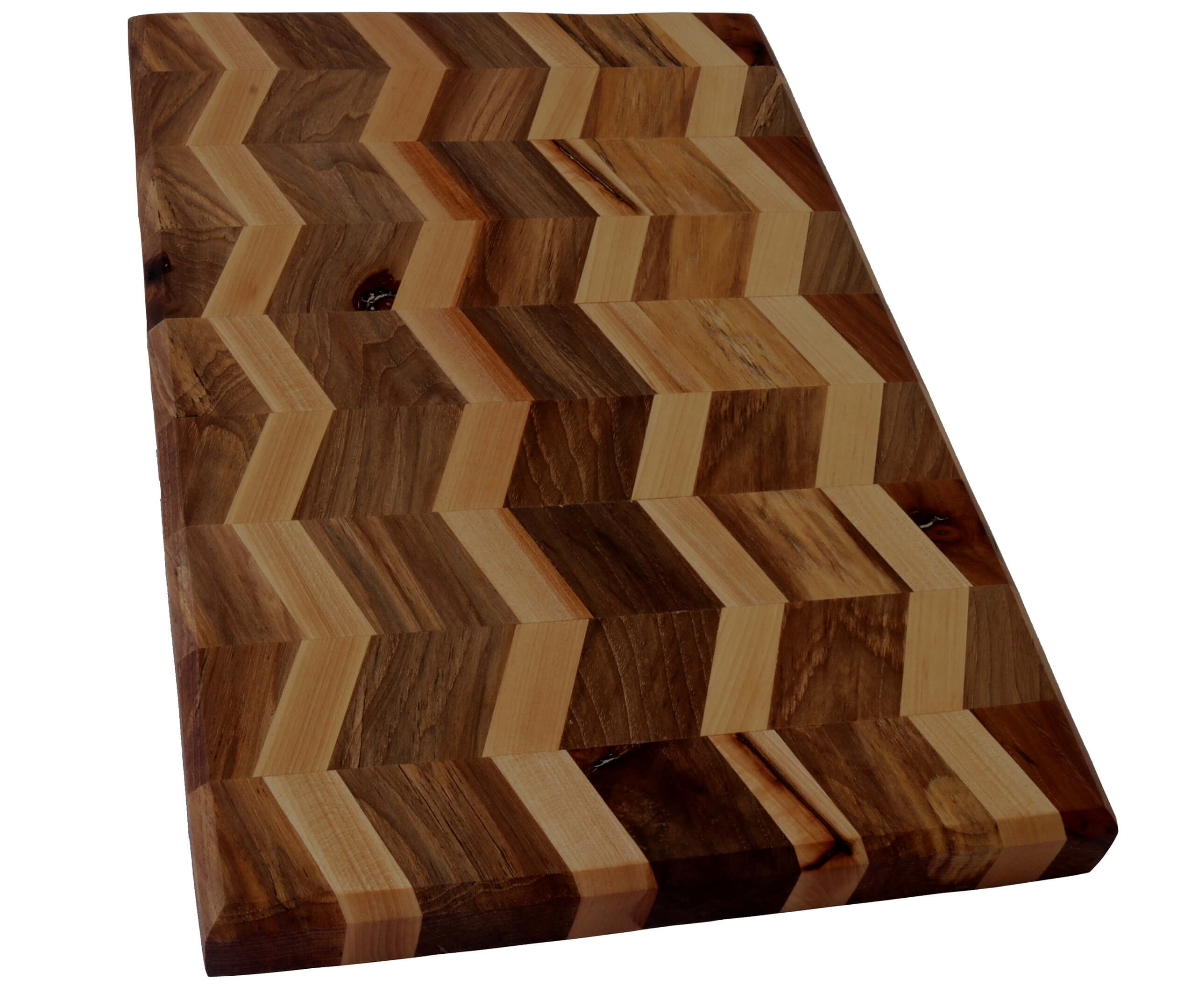 Large rectanular Chevron cutting board with beveled edges. Handcrafted with Birch, Black Walnut and Hickory wood and finished with mineral oil and cutting oil. Black rubber feet for extra support.