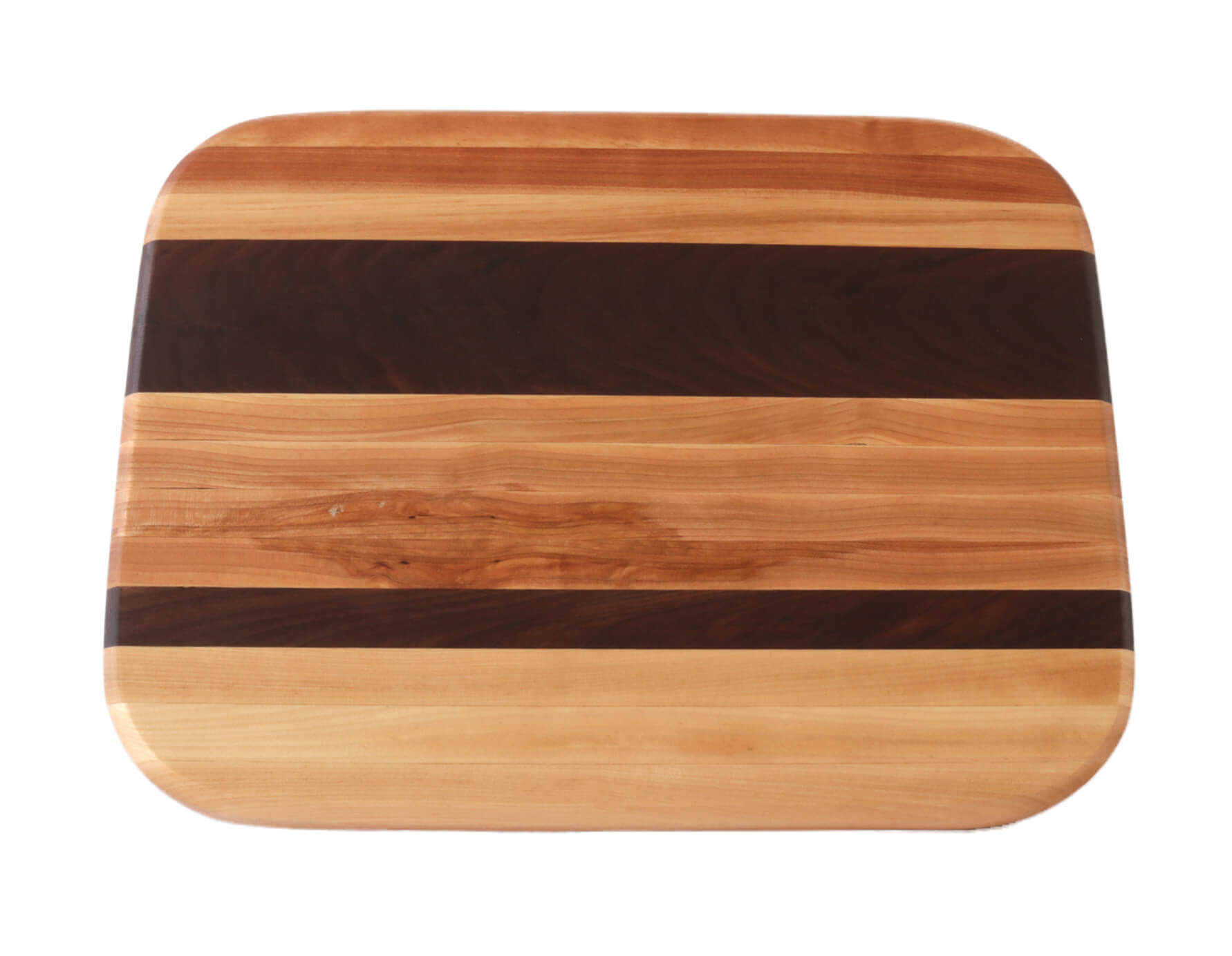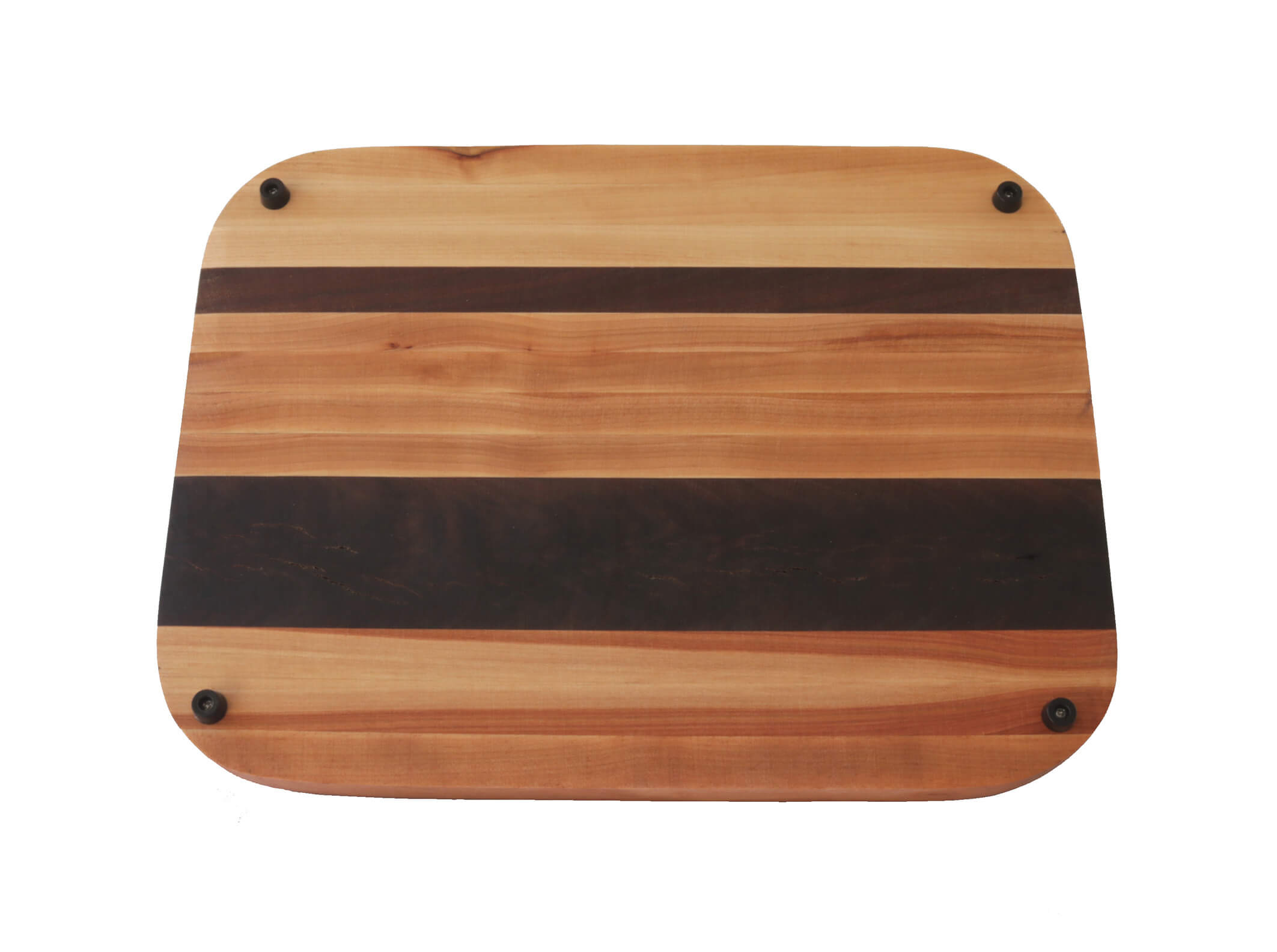 Medium size rectangular cutting board with round beveled corners. Handcrafted with birch and walnut wood and finished with mineral oil and cutting board oil. Black rubber feet for extra support.