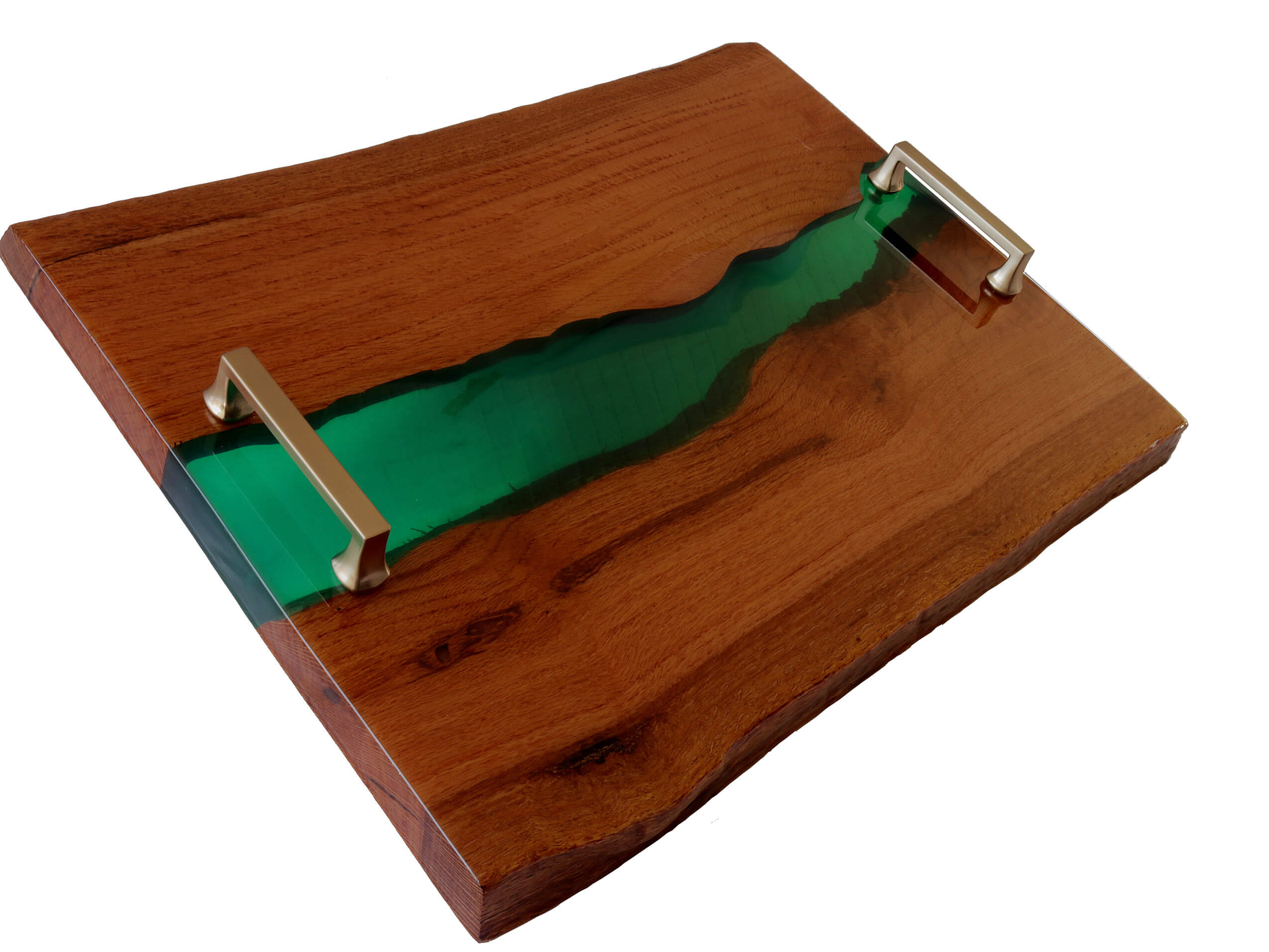 Extra large live-edge river charcuterie serving board with brass handles. Handcrafted with red oak wood and green dyed epoxy resin. Bottom sealed with polyurethane. White rubber feet for extra support.